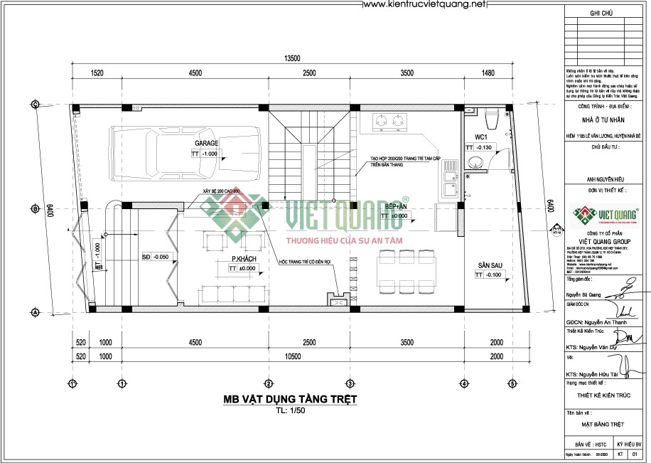 Mẫu thiết kế chi tiết nhà phố 3 tầng có gara xe hơi diện tích 6,4m x 13,5m