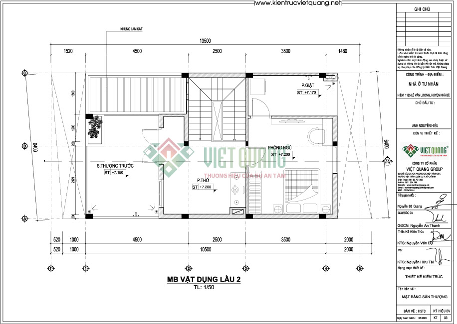Bản vẽ mặt bằng thiết kế công năng sử dụng lầu 2 + mái nhà phố 3 tầng 6,4 x 13,4m