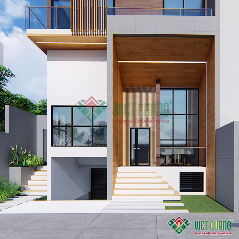 Nếu quý vị ngại việc xây dựng nhà có tầng hầm kín mít thì có thể tham khảo cách thiết kế garage để xe thông thoáng phía ngoài. Quý vị có thể thấy, các mẫu nhà được xây dựng giao thoa giữa yếu tố hiện đại kết hợp màu sắc truyền thống. Những lam gỗ bao quanh và cổng cùng tone màu trắng của ngôi nhà tạo nên một tổng thể không gian vô cùng bắt mắt.