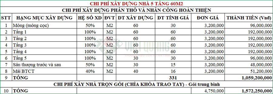 Đơn giá xây dựng nhà 5 tầng 4x15m = 60m2 chia làm 02 hình thức xây dựng như sau: