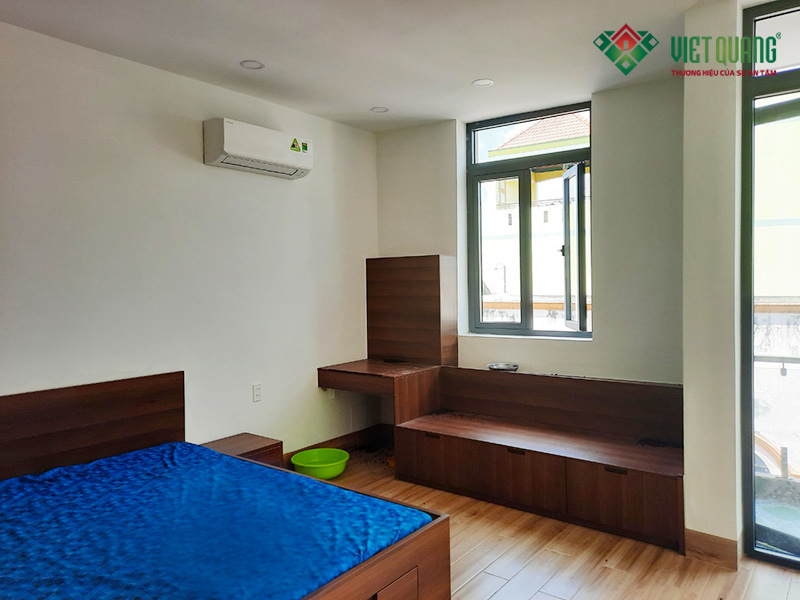 Hoàn thiện phòng ngủ với cửa số nhôm XingFa, trần thạch cao đèn âm trần, tường sơn nước màu sáng sủa, sạch sẽ.