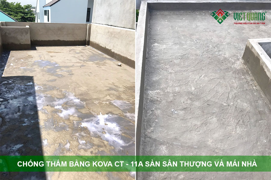 Chống thấm bằng kova CT-11a sàn sân thượng và mái nhà công trình xây nhà phố 3 tầng trọn gói anh Công quận 12