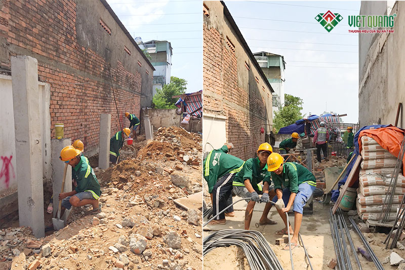 Công nhân Kiến Trúc Nét Việt đang thi công đào móng cọc (hình bên trái) và gia công lắp đặt thép móng cọc (bên phải) công trình nhà chị Trang tại quận 9