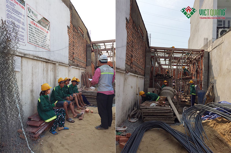 Kỹ sư hướng dẫn an toàn lao động (bên trái) và công nhân đang tiến hành lắp đạt coppa sàn lầu 1 (bên phải)